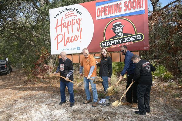 The franchisees of Navarre’s Happy Joe’s, Jeff and Jennifer Harding, break ground on the restaurant Friday, Jan. 5. Left to right: Bob Harding, Jeff Harding, Jennifer Harding, Jesse Ivarra, Diane Harding.