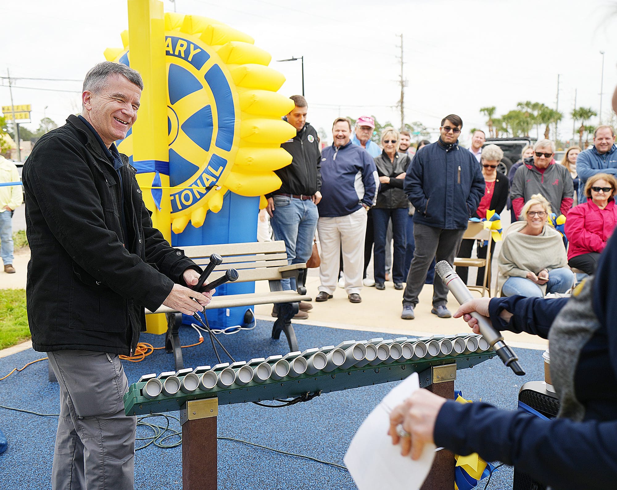 Navarre Rotary Club member London Richard smiles as he plays one of the Harmony Park xylophones for the first time. The large crowd listens and grins.
