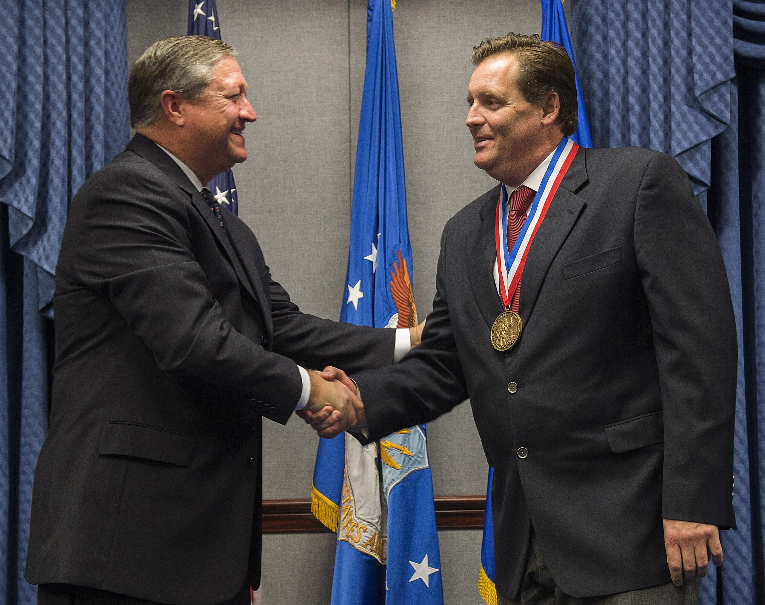 Secretary of the Air Force Michael Donley (left) congratulates Chris Sehman after presenting him with the 2011 Zachary and Elizabeth Fisher Distinguished Civilian Humanitarian Service Award during a ceremony held in the Pentagon, Washington, D.C., Jan. 10, 2013. Sehman distinguished himself as a local community and business leader in the Florida Emerald Coast area. He has been a staunch advocate for the Special Operations Warrior Foundation and Wounded Warrior Program and helped to generate several hundred thousand dollars through fund raising efforts that directly benefited more than 30,000 military members and their families living and serving throughout the Florida panhandle area. (U.S. Air Force photo/Jim Varhegyi)(released)