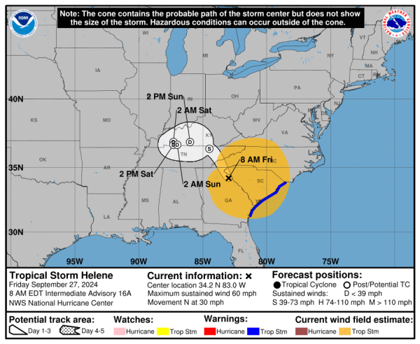 Soon after it crossed over land, Helene weakened to a tropical storm, with its maximum sustained winds falling to 70 mph (110 kph). At 5 a.m., the storm was about 40 miles (65 kilometers) east of Macon, Georgia, and about 100 miles (165 kilometers) southeast of Atlanta, moving north at 30 mph (48 kph), the National Hurricane Center in Miami reported.