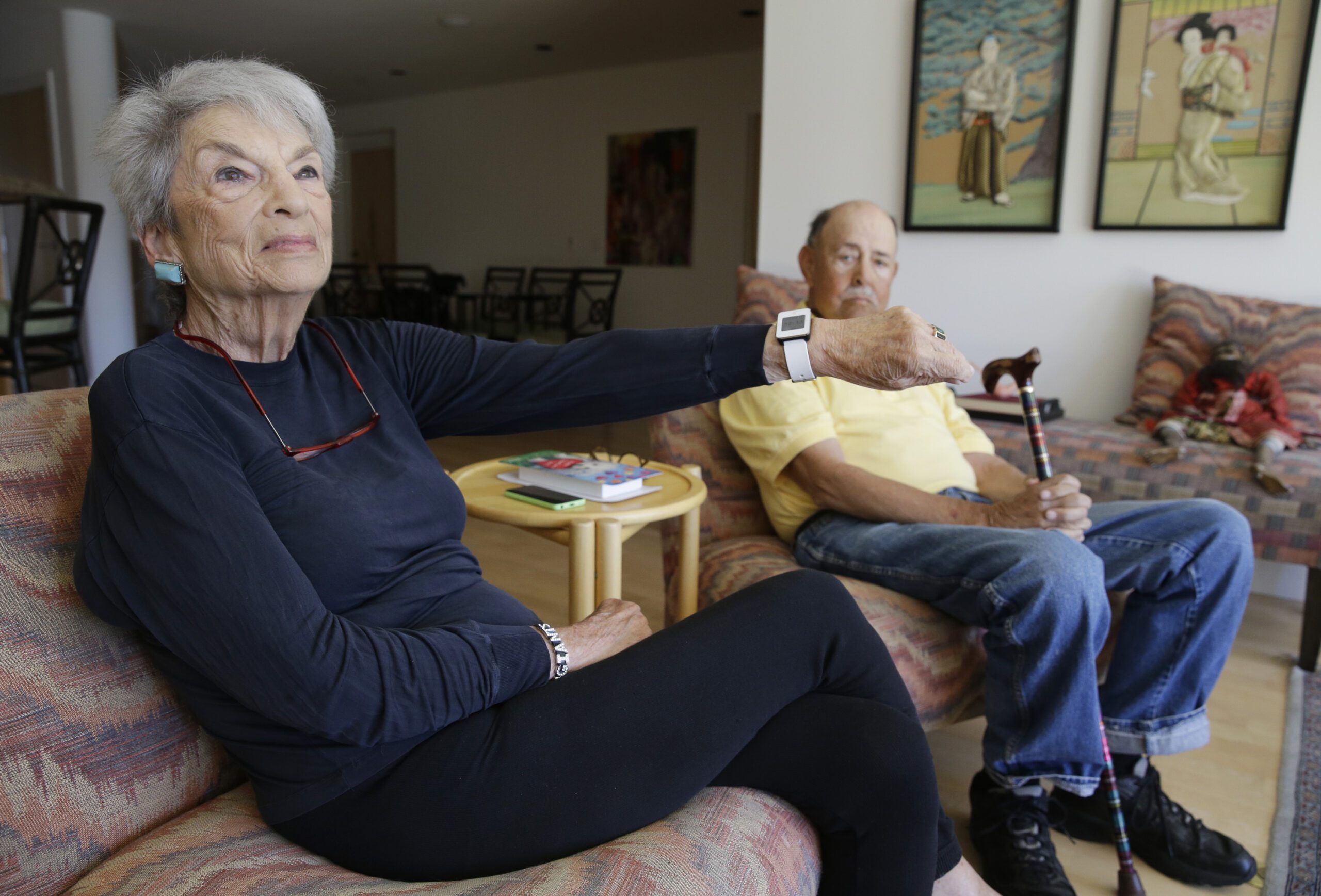 Dorothy Dworsky, 80, sitting next to her husband, Bill, 81, shows a watch she wears that keeps track of her movements at their home in San Francisco. Each time Bill or Dorothy opens the refrigerator, closes the bathroom door or lifts the lid on a pill container, tiny sensors in their home make notes on a digital logbook, which their son Phil Dworsky monitors daily on his smartphone.