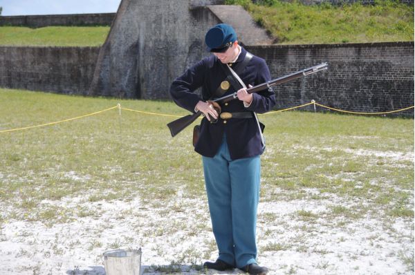 Caleb Pascoe is at historic Fort Pickens taking practice shots with a black powder rifle in preparation for a demonstration later that morning.