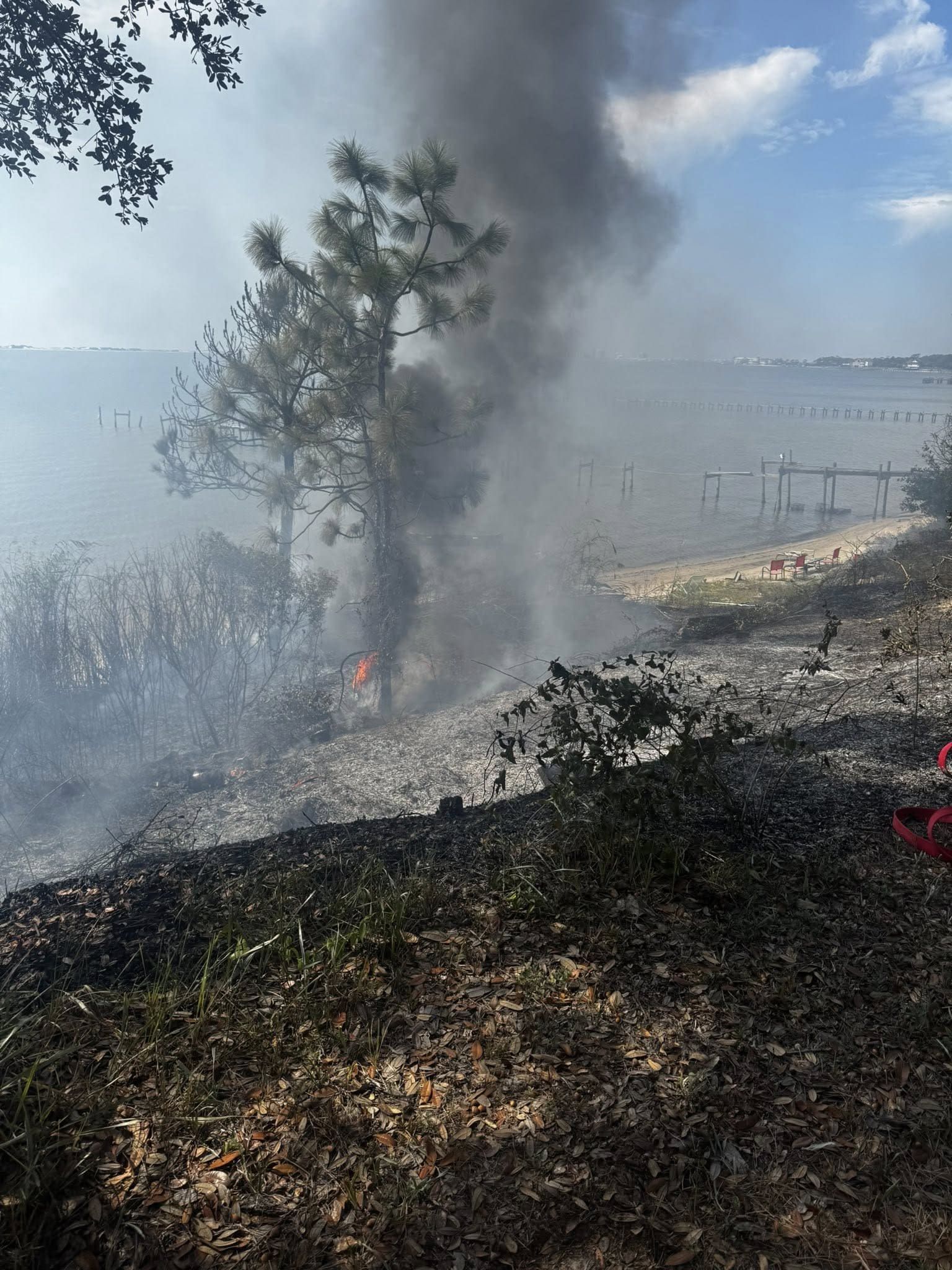 A brush fire blazes at a soundside residence. Holley Navarre Fire District soon arrived and put out the fire.