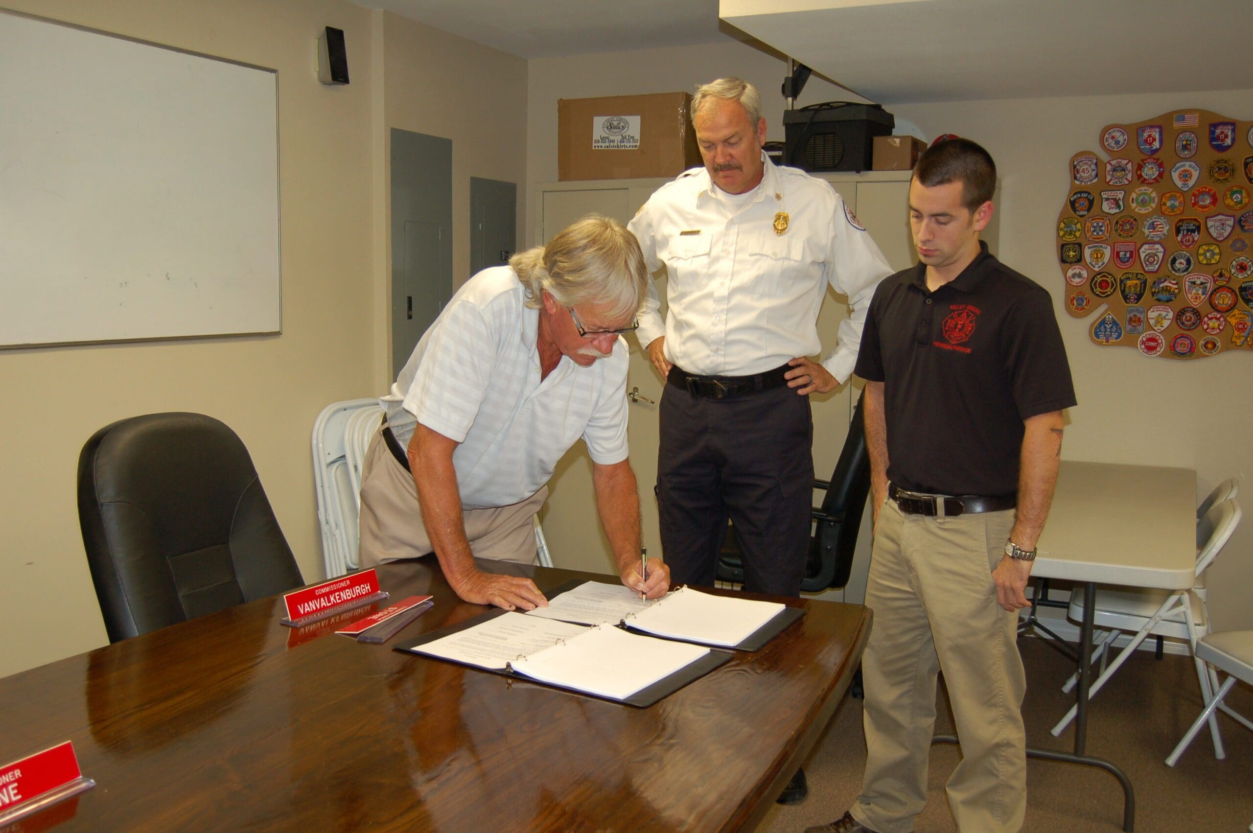 Former Holley-Navarre Fire District Chief Ron Norton (center) and former Union No. 4695 President Eric Shoultz (right) look on as Board of Commissioners Chairman David Stone signs the union agreement. Navarre Press file photo.