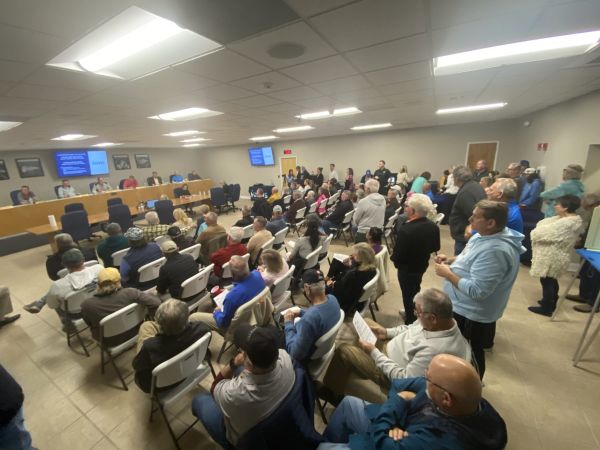 Members of the Holley Navarre Water System packed into the HNWS meeting room for the Annual meeting Tuesday night. On the agenda were two votes: the election of new board members and the dismissal of current board members. (Photo from Feb. 18, 2025)