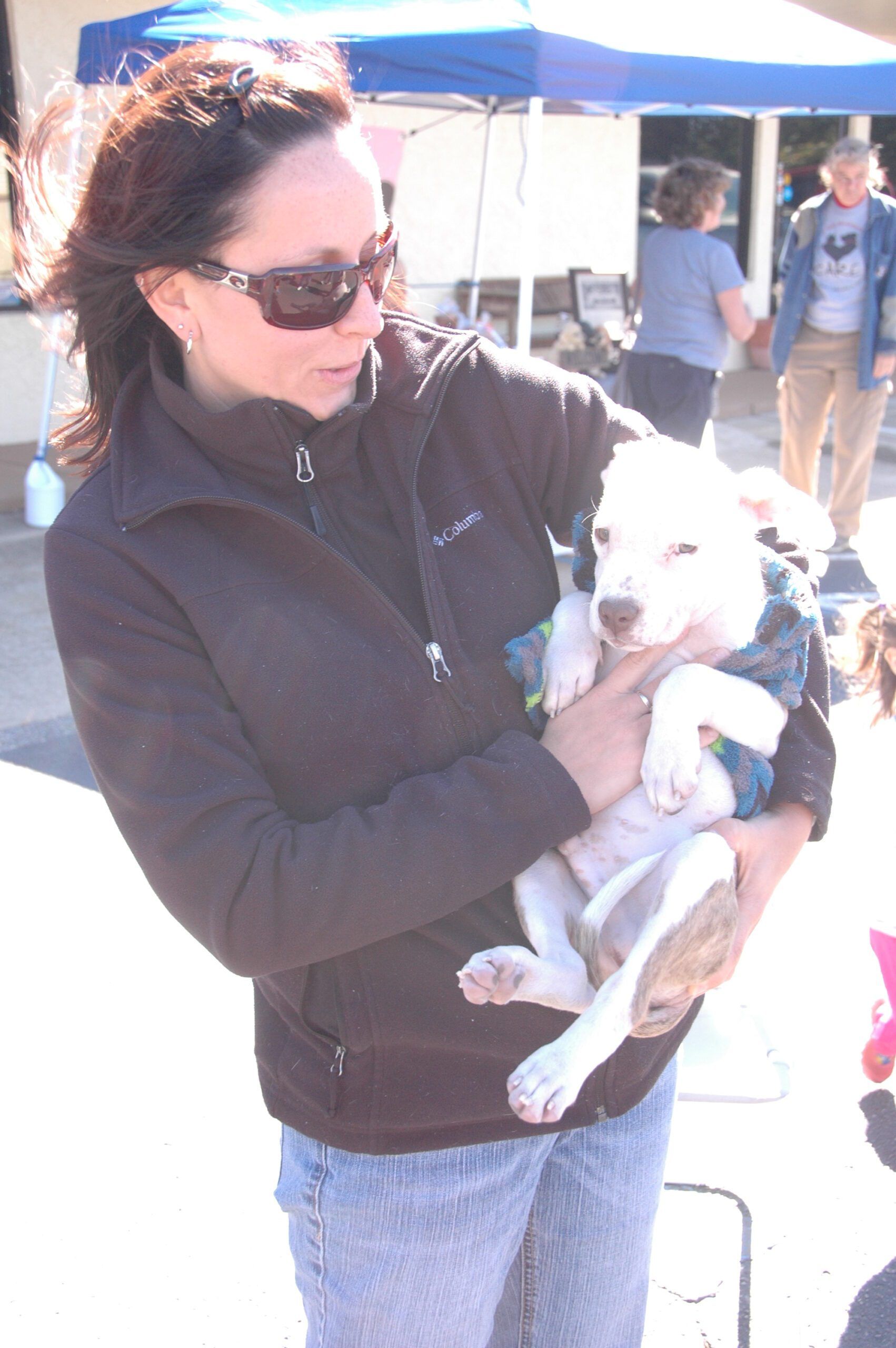 Laura Booth with SouthBark, which operates from Mississippi to Navarre, keeps Max warm during the Furever Friends Adoption event Nov. 1 in Navarre. SouthBark rescues more than 1,000 animals per year who are at the highest risk of euthanasia from shelters.