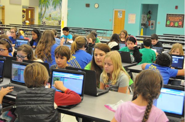 The cafeteria inside Holley Navarre Intermediate School was turned into a computer lab Monday morning. Wearing headphones and smiles, eager students sat in front of computers and put their tech skills to use during the Hour of Code.