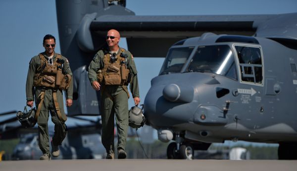 Capt. Arjun Rau and Master Sgt. Alberto Delgado walk in front of the CV-22 Osprey, a plane they flew through a dangerous humanitarian mission in which they took fire from heavy machine guns and rocket-propelled grenades.