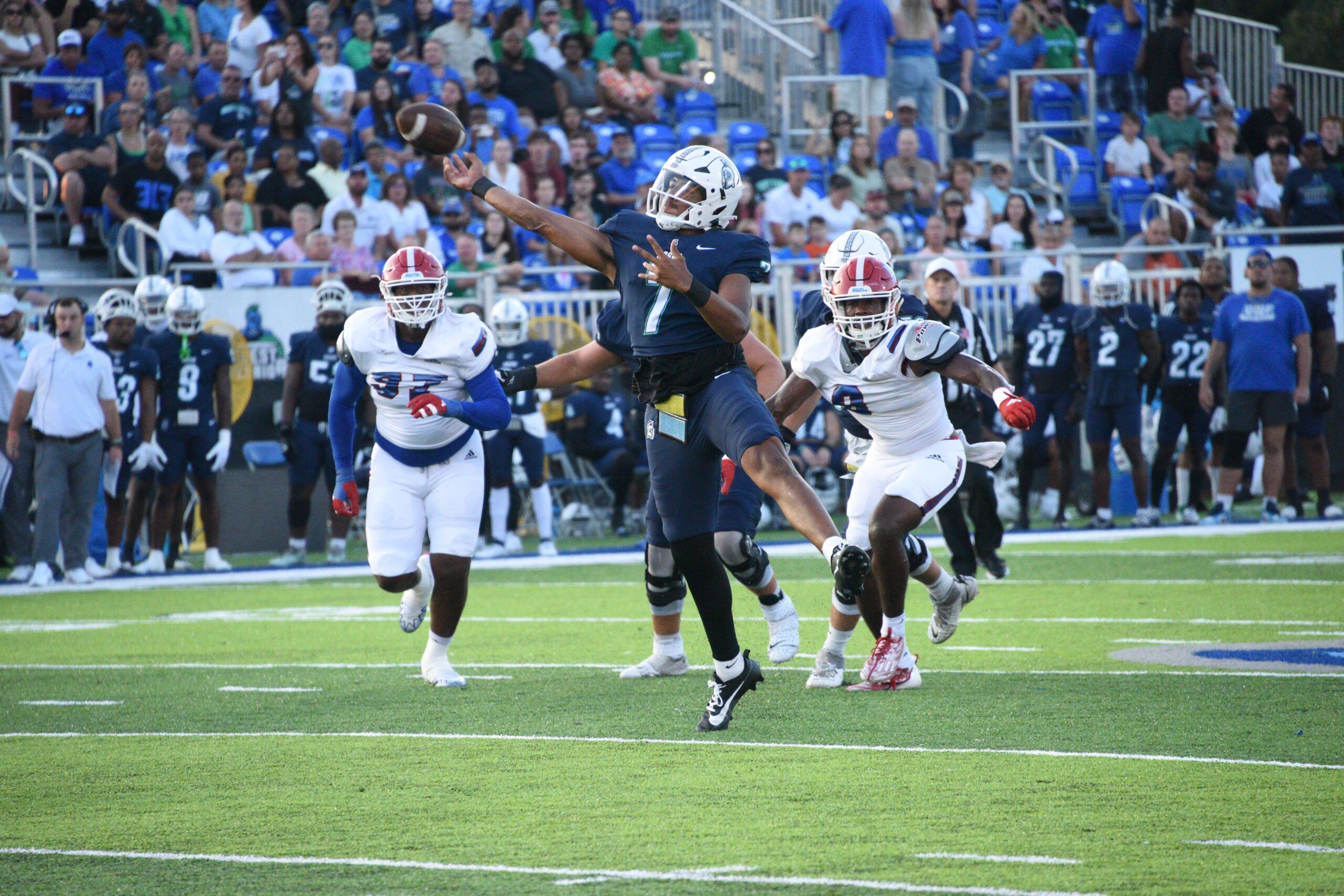 Byron Jarrett throws a pass in the first half of UWF’s game against West Georgia Saturday. (Photo by Brian Lester)