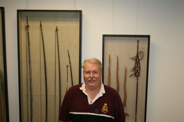 William Lake stands with part of his collection of Indonesian weapons that are on display at the Navarre Library through the end of February.