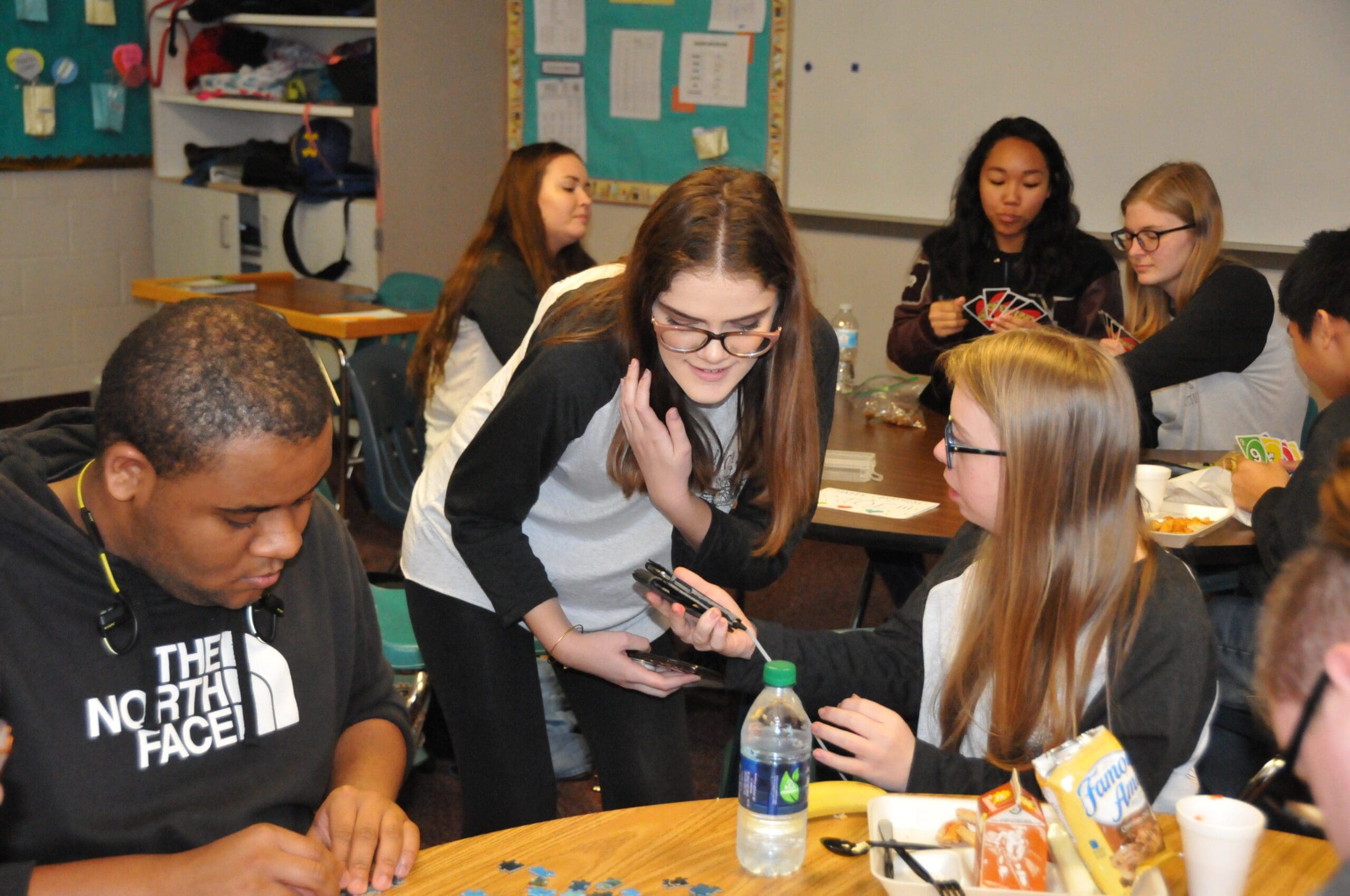 Inside a classroom at lunchtime, Emily Sands is sitting next to a student at a table. They are scrolling through pictures on her phone.