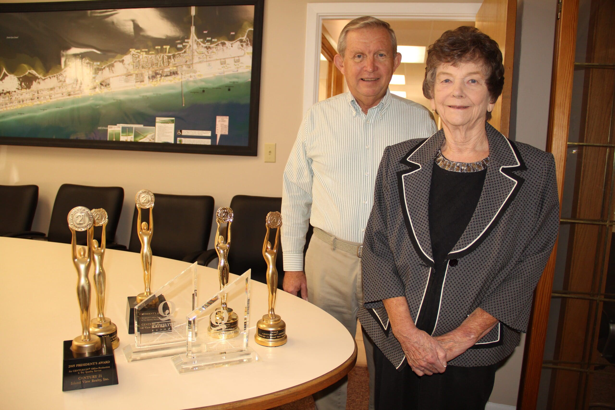 Century 21 Island View Realty partners Phil Babiak and Ira Mae Bruce show off a handful of the awards the company has earned during its 40-year history.