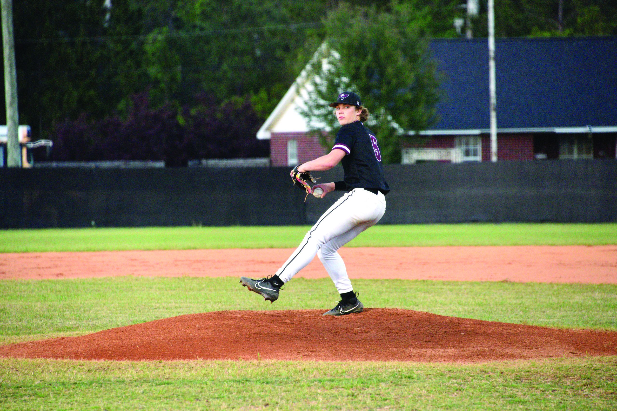 Ace DeMotts gets set to throw a pitch in the opening inning of Navarre’s game against Booker T. Washington.