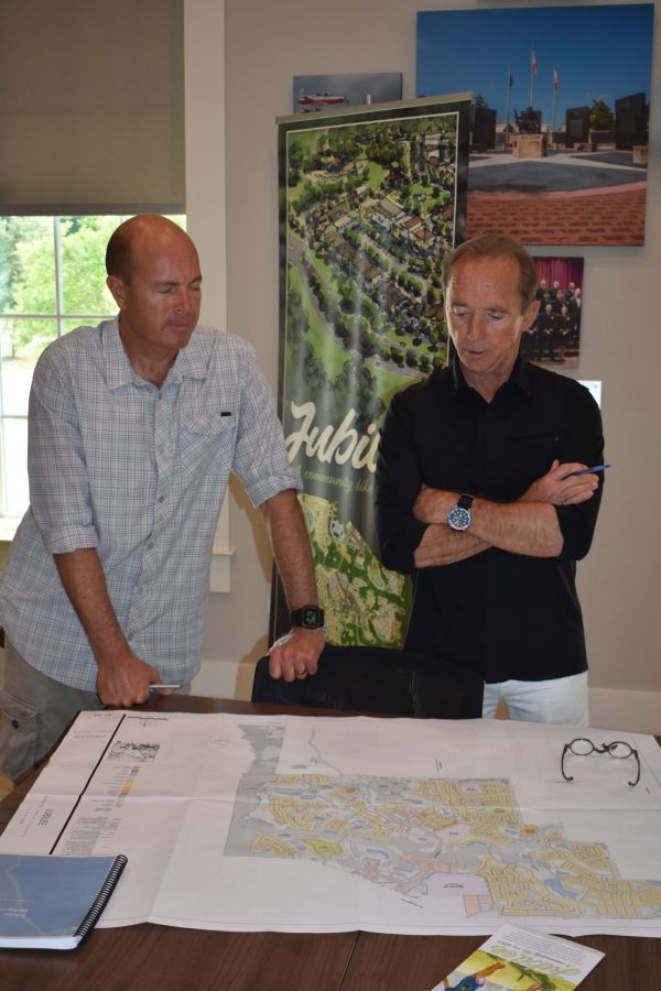 Ryan Fowler, left, of Pace, and Ron Reeser of The Eagle Group discuss plans for the Jubilee master-planned community.