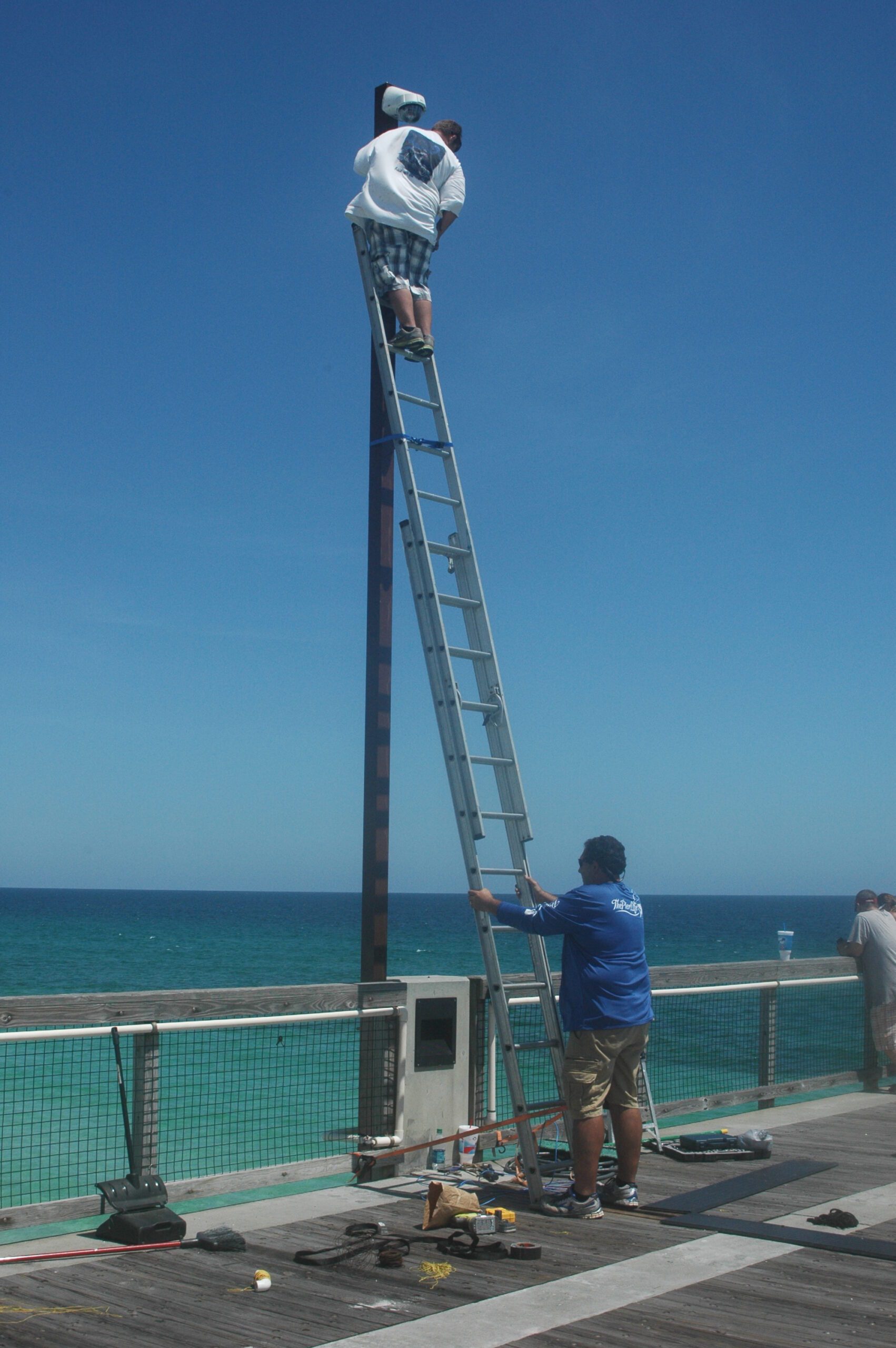Workers install equipment to support a live webcam on the Navarre Beach Fishing Pier Tuesday afternoon.