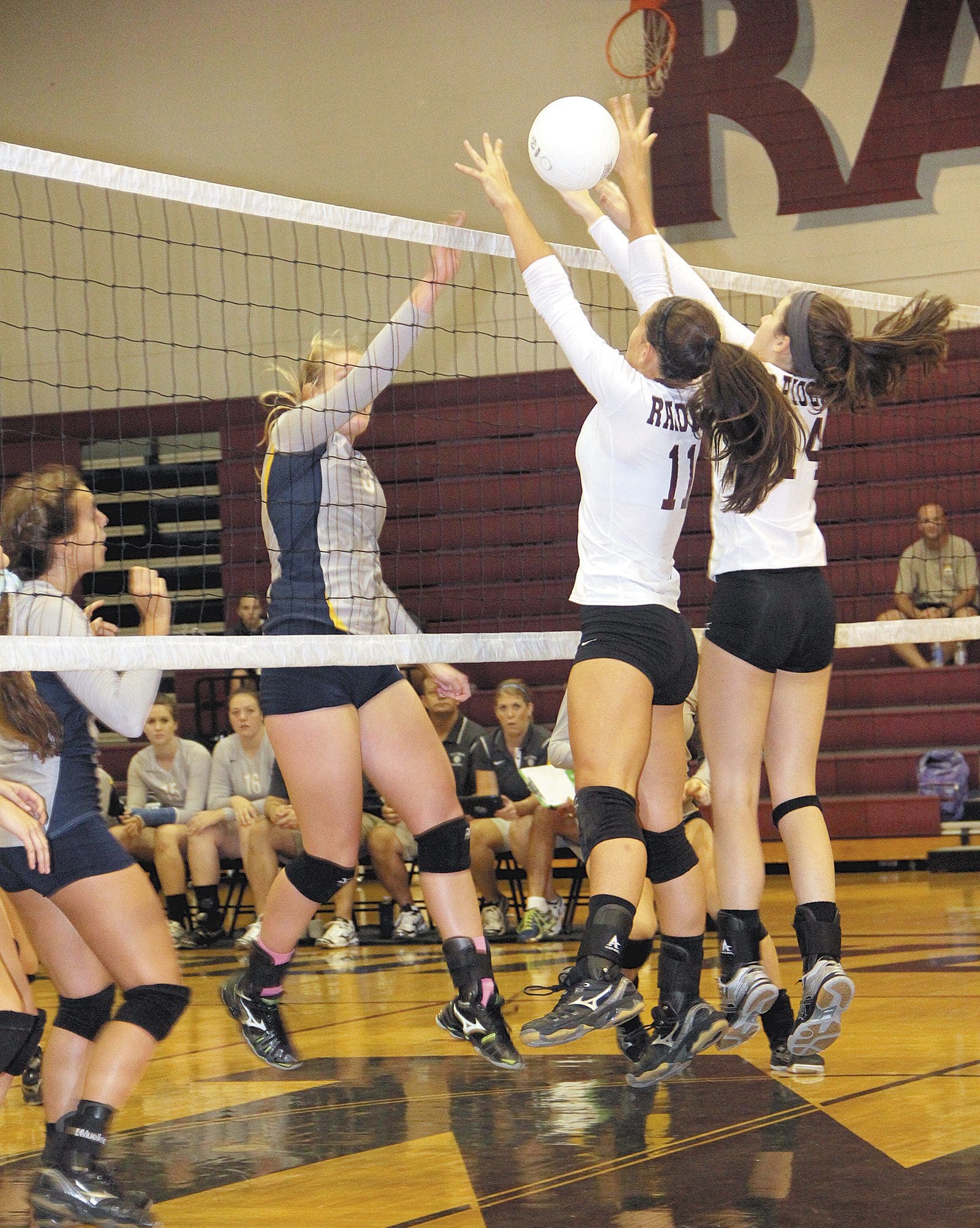 Kiera Foster, #11, and Shelby Freese #14 block against Gulf Breeze