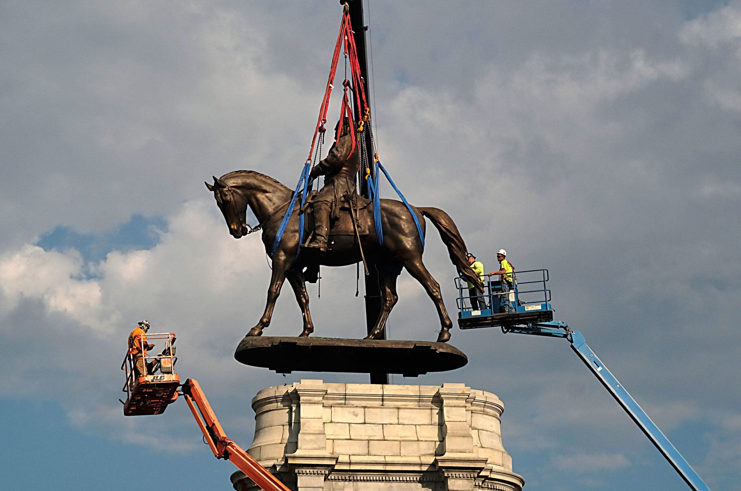 A statue of Confederate Gen. Robert E. Lee is removed from its pedestal on Monument Avenue on September 8, 2021, in Richmond, Virginia.