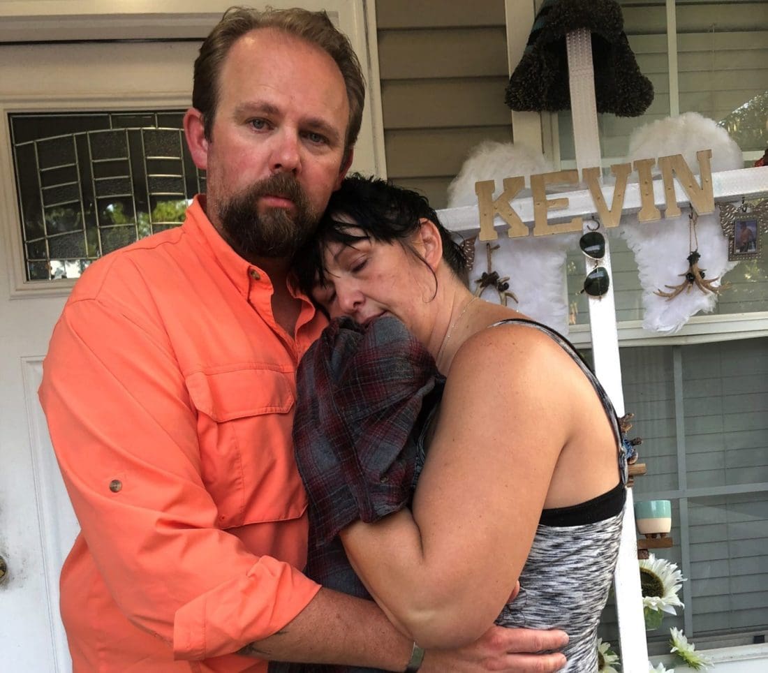 Andrew and Melanie Wallace are drowning in grief over the Oct. 1 hit and run death of their oldest son, Kevin. The cross in the background will go near the scene of the accident. She cuddles one of her son’s shirts, just as she has every minute since he died. Photo by Wendy Victora Rudman