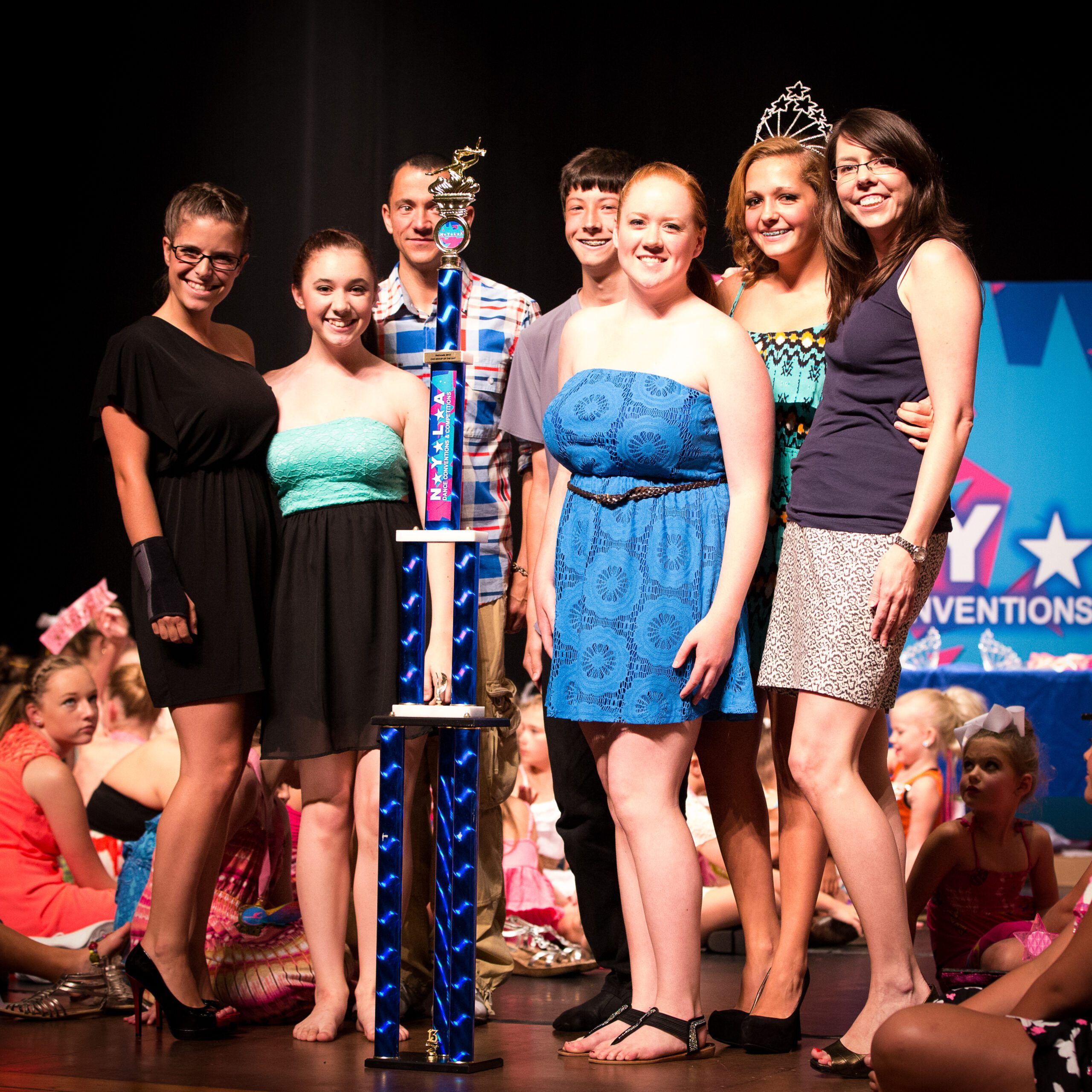 Megan Gragg, Casey Colvin, co-owner Robert Kelley, Tim Smith, Alexa Poscic, Courtney Bruce and co-owner Brie Schell are pictured with the trophy for the “Raining Men” performance in the 12 and older category.