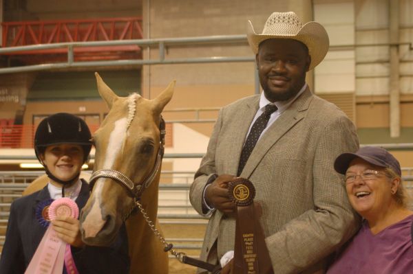 K-Lani Rae Vickery with Coco Padron, horse owner Paul Stewart from Cleveland, Ohio, and horse trainer Janet Evans from The Equestrian Center in Fort Walton Beach celebrate a “Top 5” finish in the 2014 Palomino World Championship Show.
