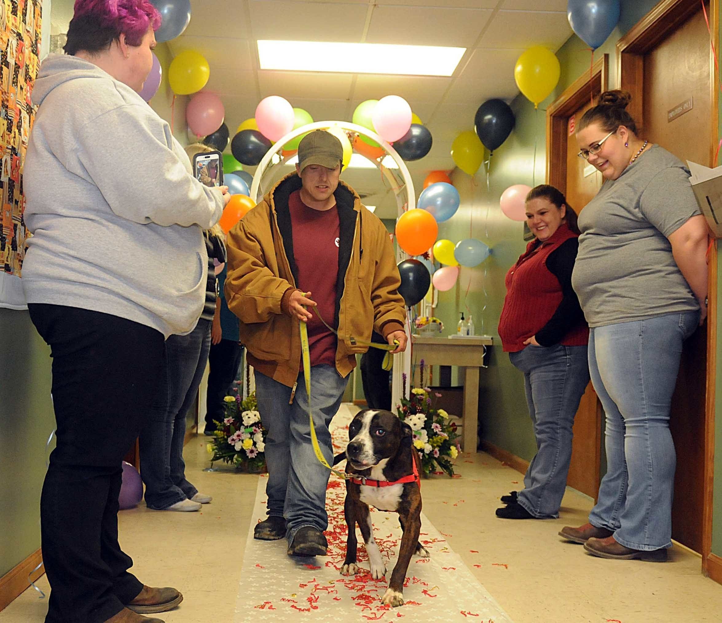 This Wednesday March 2, 2016 photo shows Coffee, a long-time resident at the Mercer County Animal Shelter in Princeton, W.Va. Coffee was given the red carpet treatment as his caretaker at the shelter, Melissa Gross, leads him down the shelter’s main hall for the last time. The shelter’s staff lined the hall to say their goodbyes as Coffee left for his new home with a foster family in Tennessee.”(Jon bolt/Bluefield Daily Telegraph via AP)