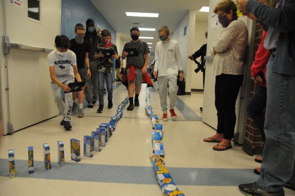 A group of students follows the path of the boxes through the hallway of Woodlawn Beach Middle School. Photo by Brian Lester