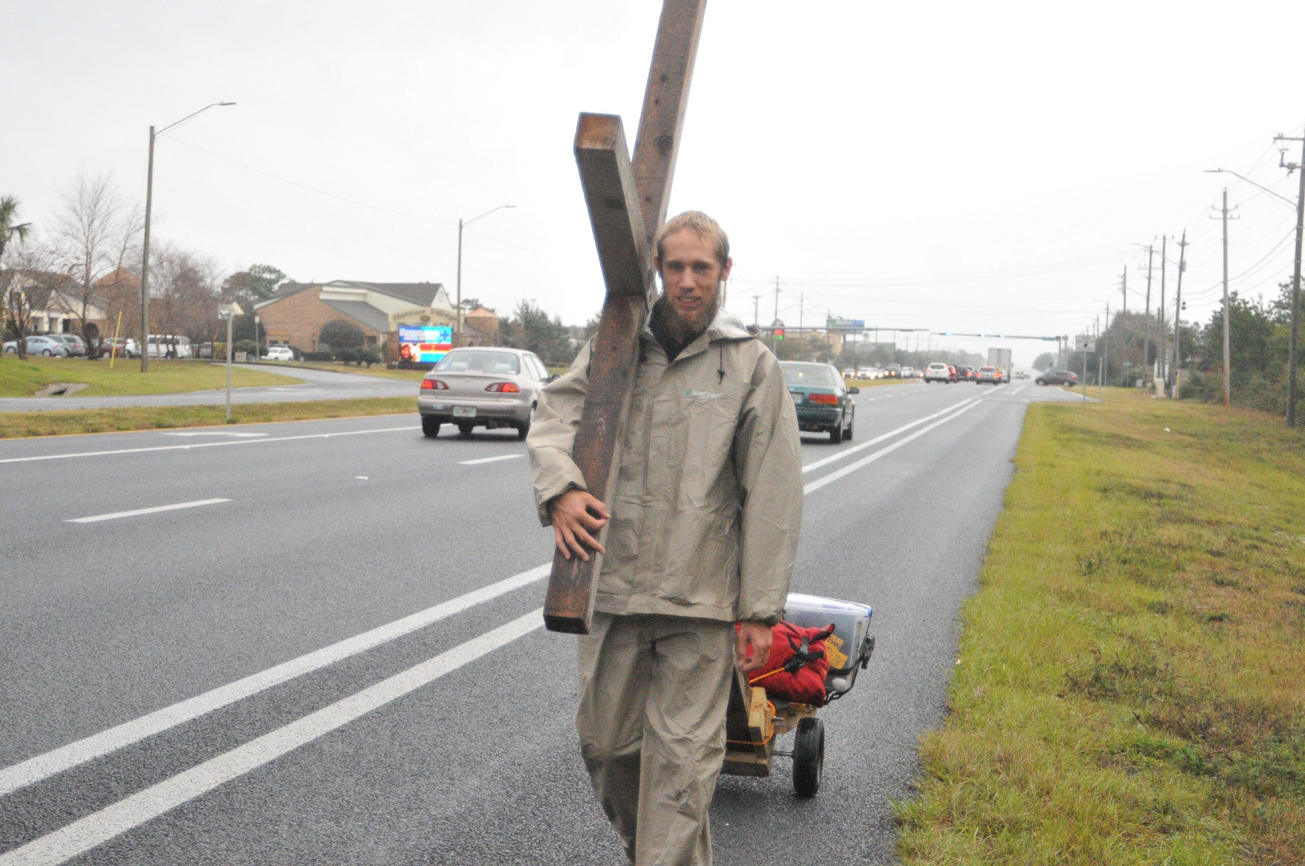 As a light rain fell Monday morning, Mitchell Manning walked along Highway 98 in Navarre carrying a wooden cross, the bottom of laying on a wagon that also holds supplies for his trip.