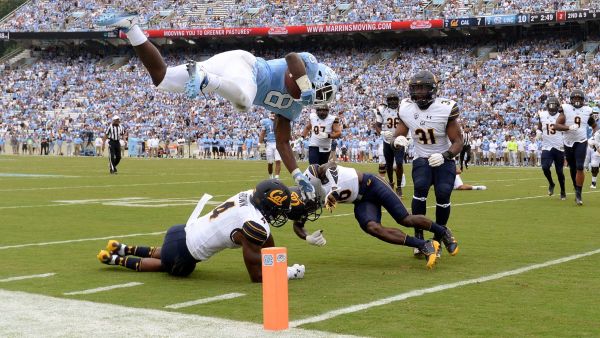 Michael Carter scores a touchdown in his UNC debut against California in 2017. Photo Credit: UNC Athletics