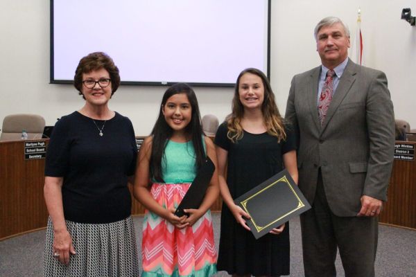 Holley-Navarre Middle School TIP award recipients pose with School Board members during the June 10 School Board meeting. Lauren Bautista, Olivia Coleman, Katherine Fey and Angelia Morris received the state recognition for their scores.