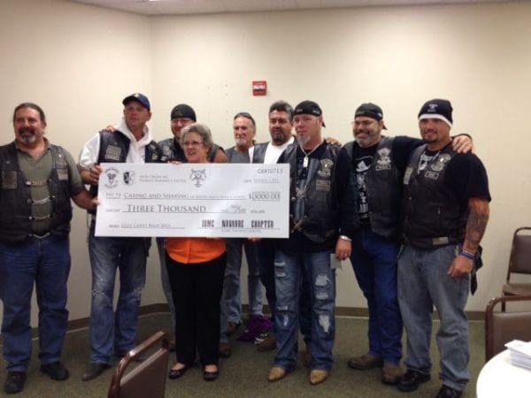 The Navarre Chapter of the Iron Order Motorcycle Club presents a check for $3,000 to Caring and Sharing of South Santa Rosa County.