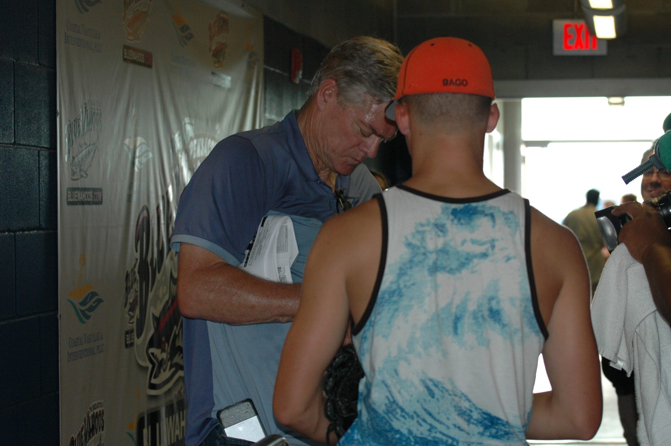 Dale Murphy talks with reporters outside the Pensacola Blue Wahoos clubhouse last Wednesday night as a handful of fans watch on, their eagerness unmistakable as they wait for the chance to have the former Atlanta Braves star sign an autograph.