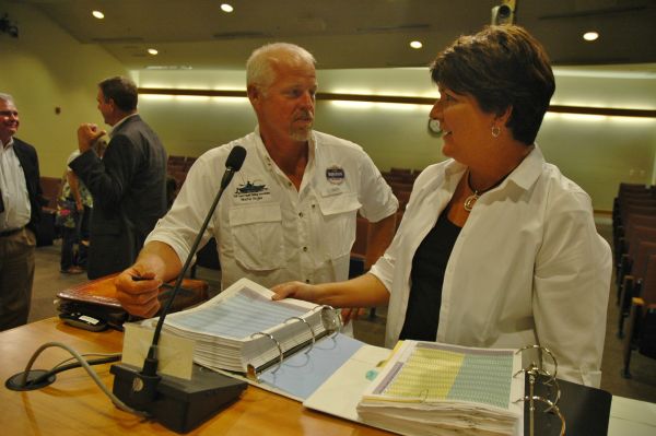 Laurie Gallup, a Navarre Beach property manager, shows Navarre resident Bob Boston books filled with cancellations resulting from the 2010 Deepwater Horizon oil spill.