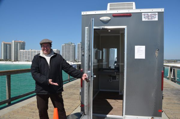 Pier manager Ken Fountain holds open the door to the new restroom on wheels, parked near the end of the Navarre Beach Fishing Pier.