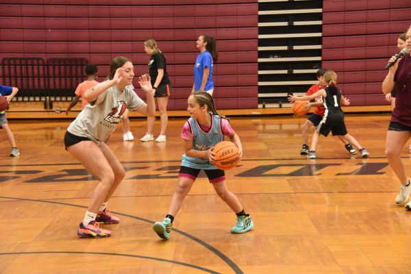 Abby Fogg holds the mic and is giving instructions to the young athletes who have turned out for the latest edition of the Navarre Raider basketball camp.