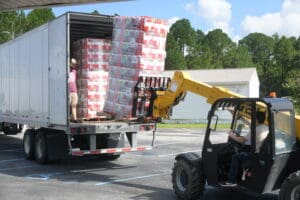 Isaac Librande (inside the forklift) brings packages of drinks towards the doorway of Navarre First Assembly of God. The church was unloading a semi-truck July 31 for Day of Hope.