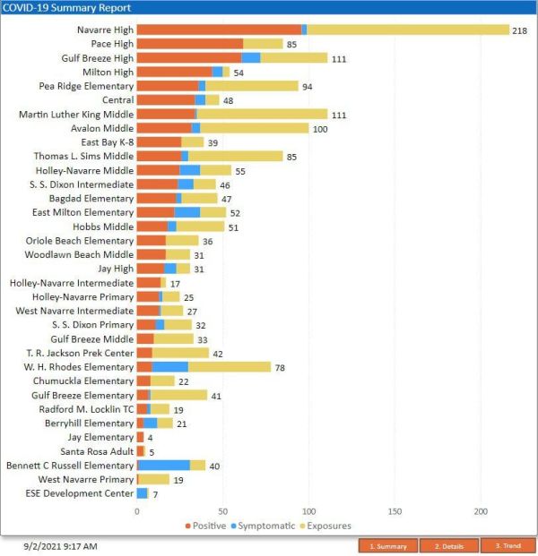The Santa Rosa County School District’s daily COVID-19 summary report shows that Navarre High School has the most exposure cases and the most positive cases in the district. NHS had a total of 218 exposure cases and 96 positivity cases.
