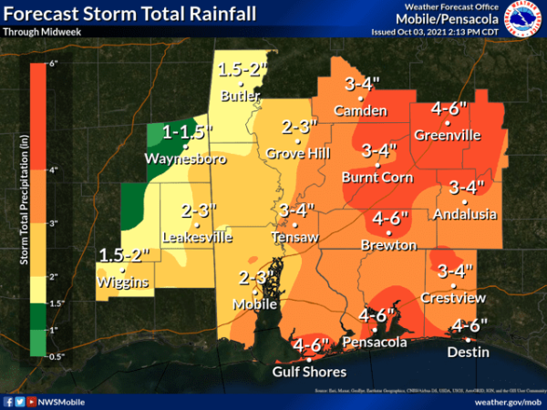 About 2 to 4 inches of rain have already fallen across southern Santa Rosa and Okaloosa counties and an additional 1-inches is possible, according to the National Weather Service’s flash flood warning issued at 8:20 a.m. Monday morning.