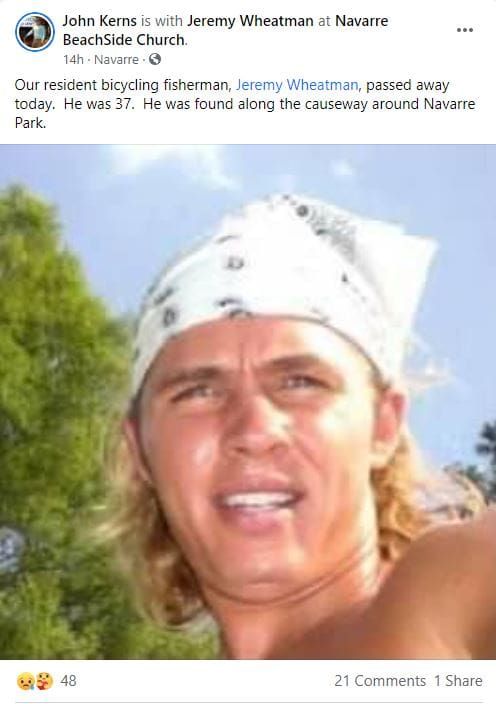 When Jeremy Wheatman died sometime before 4:49 Sunday afternoon, it was fitting that his pastor was one of the first Navarre people to hear the news. John Kerns, pastor of Navarre Beachside Church, holds regular services at Navarre Beach, where Jeremy frequently hung out.