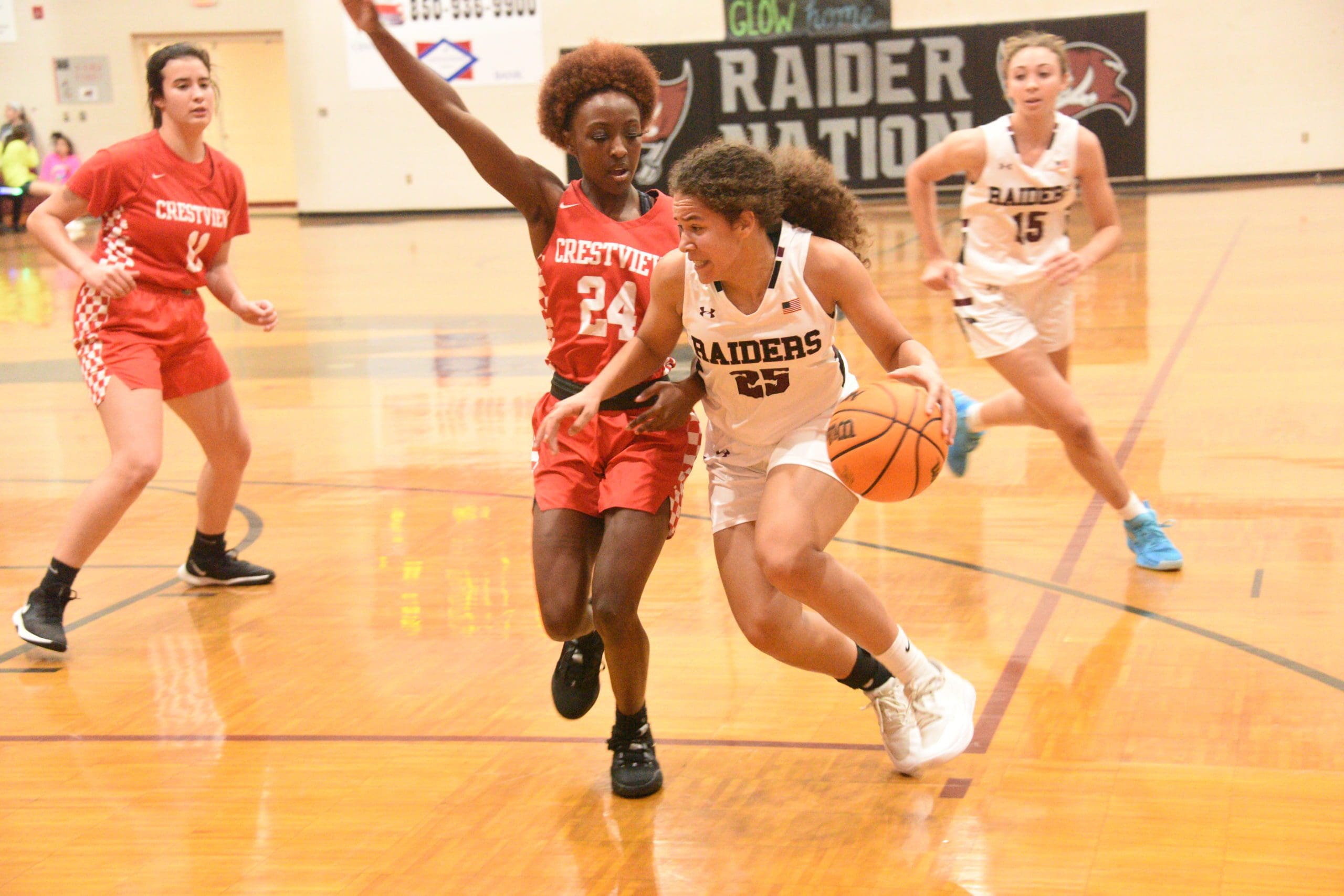 Jayah Jones looks for room to dribble around a defender during a showdown with Crestview.