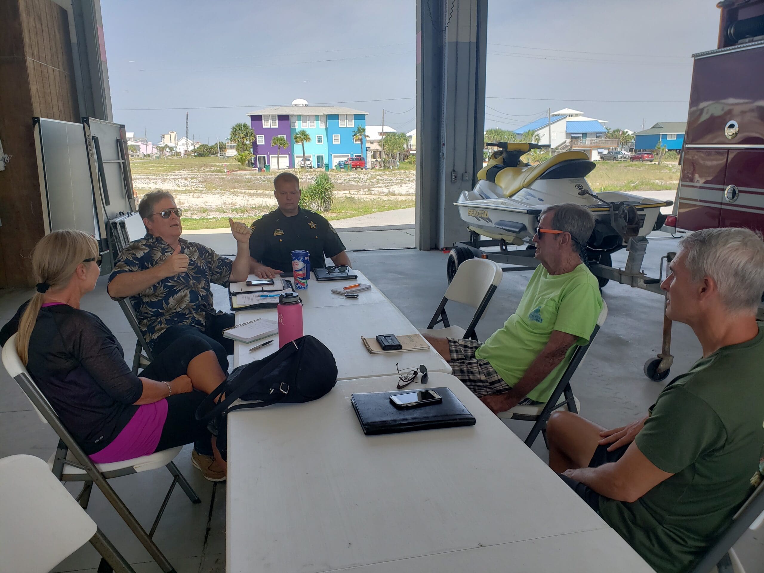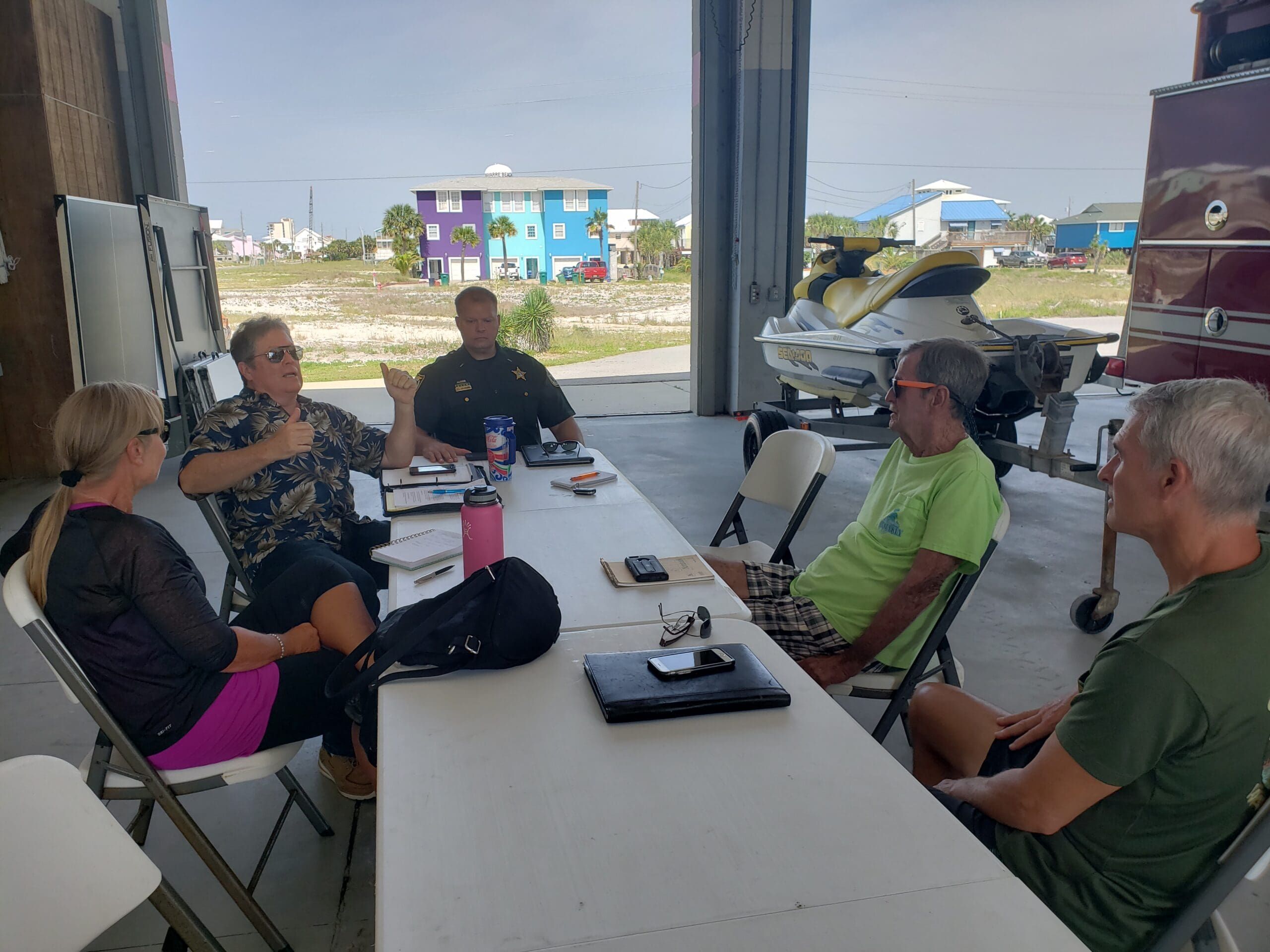 Navarre Beach Neighborhood Watch leader Ed DeCoste discusses possible safety improvements along White Sands Boulevard with Robin Otto, Lt. Jason Erlemann, Jerry Smith and Larry Hoffman.