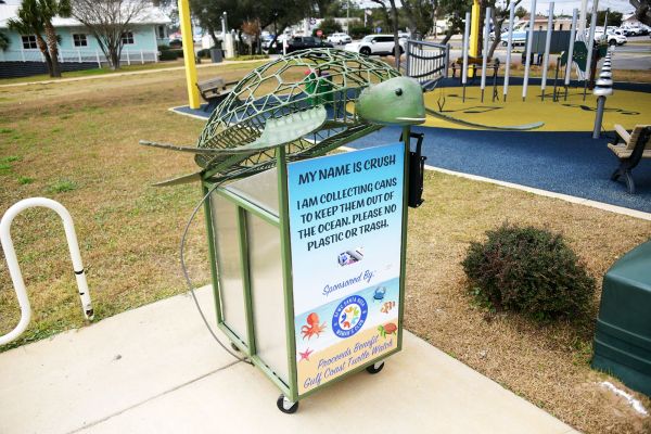 For the past couple of months, Navarre Park has been home to a five-foot-tall recycling receptacle with a large turtle sculpture affixed to the top of it. Nicknamed “Crush,” an ode to the turtle from the Disney movie “Finding Nemo,” the receptacle accepts aluminum cans only and has a can crusher attached to the side.