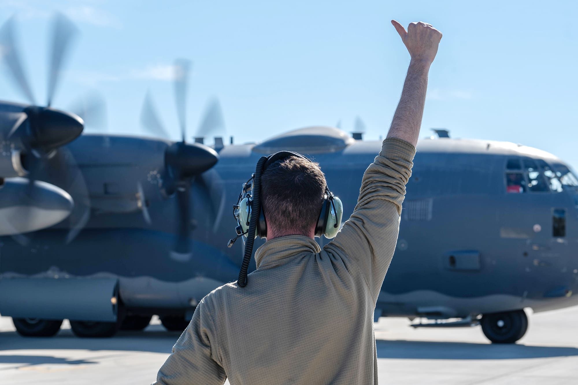 A 4th Special Operations Maintenance Squadron Airman directs a 4th Special Operations Squadron AC-130J Ghostrider gunship, as it prepares to taxi at Hurlburt Field, Florida, Dec. 4, 2024. The aircraft was used in a Next Generation Aircrew Protection team test to evaluate the effectiveness of chemical stimulant vapor purge systems during flight. (U.S. Air Force photo by Airman Samantha Rossi)