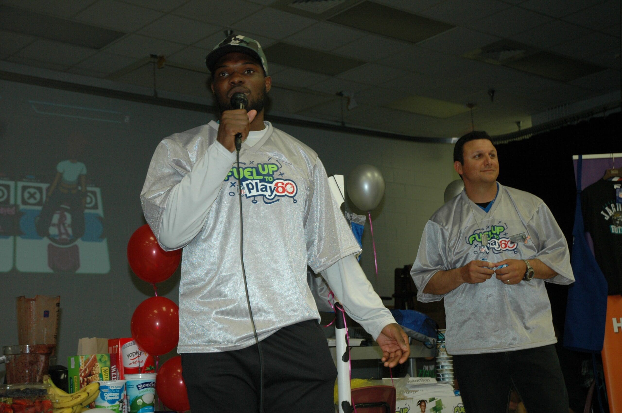 Jacksonville Jaguars linebacker LaRoy Reynolds and Holley-Navarre Middle School Dean Pete Della Ratta talk to students about healthy eating habits
