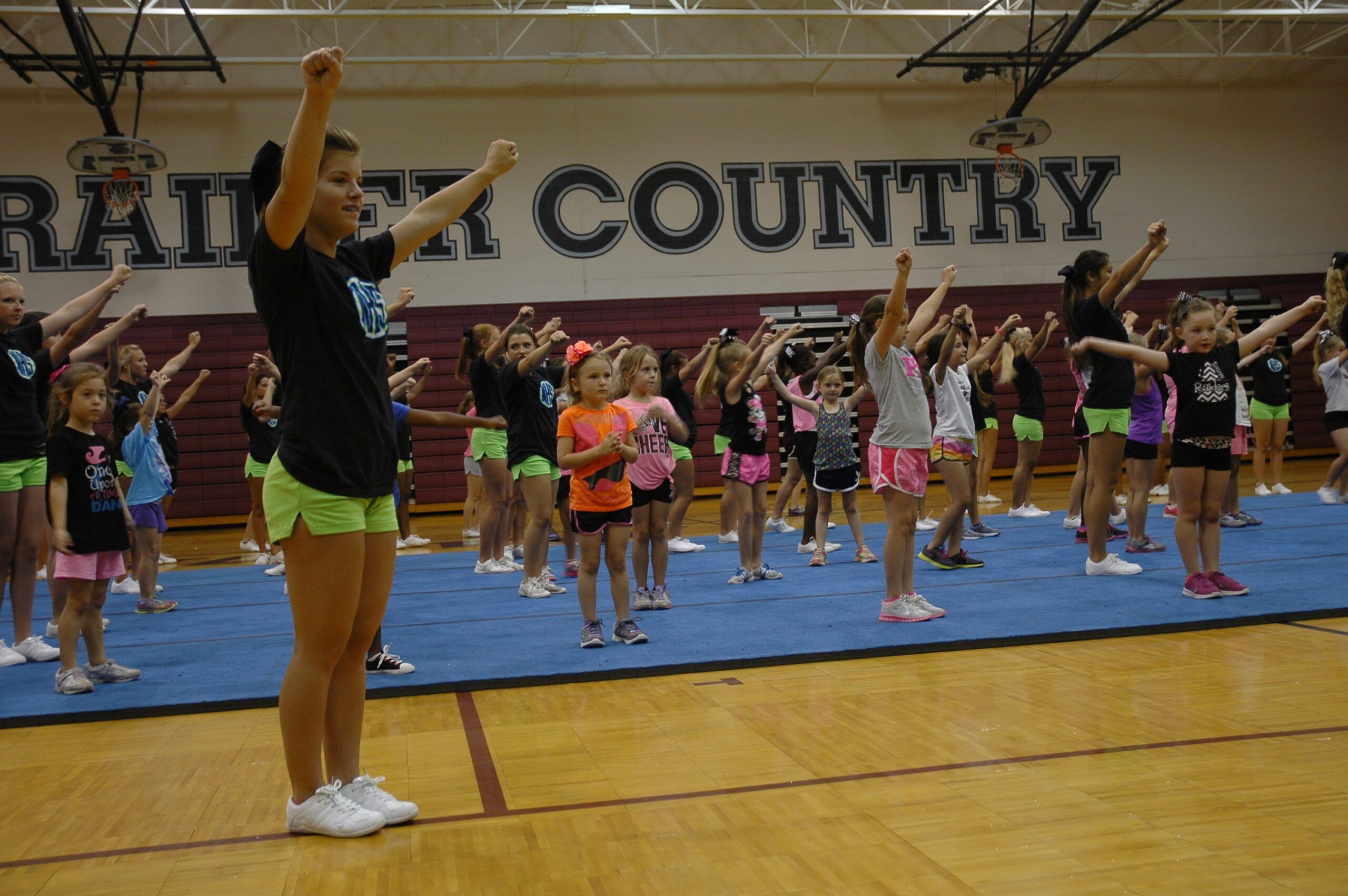 Navarre High School cheerleaders guide younger cheerleaders as they learn movements and jumps.