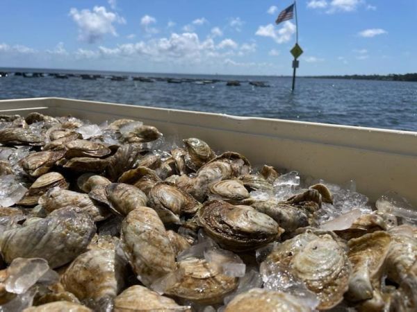 Those objects in the water are not traps—they are oyster farms, put there by Emerald Tides Oyster Company.