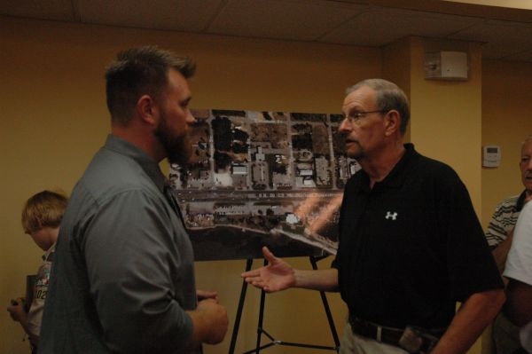 Ray Corbitt, a Florida Department of Transportation project manager, discusses the proposed U.S. 98 pedestrian overpass project with Navarre resident Ralph Agnew, a member of the Florida-Alabama Transportation Planning Organization’s Citizen Advisory Committee, Tuesday night at an informational meeting.