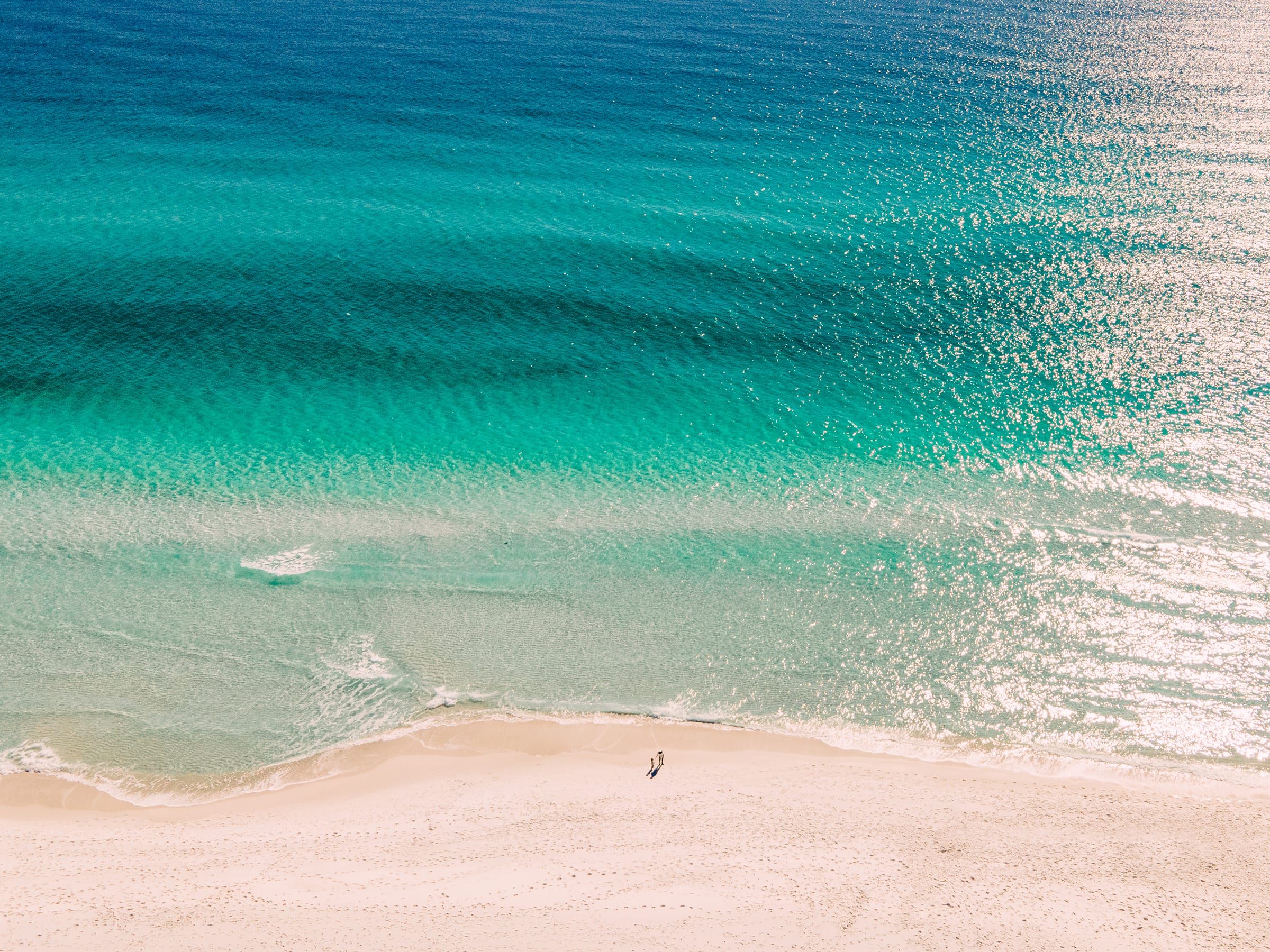 Her husband used a drone to capture this aerial image of Debbie and their son walking along the shoreline as they searched for shells.