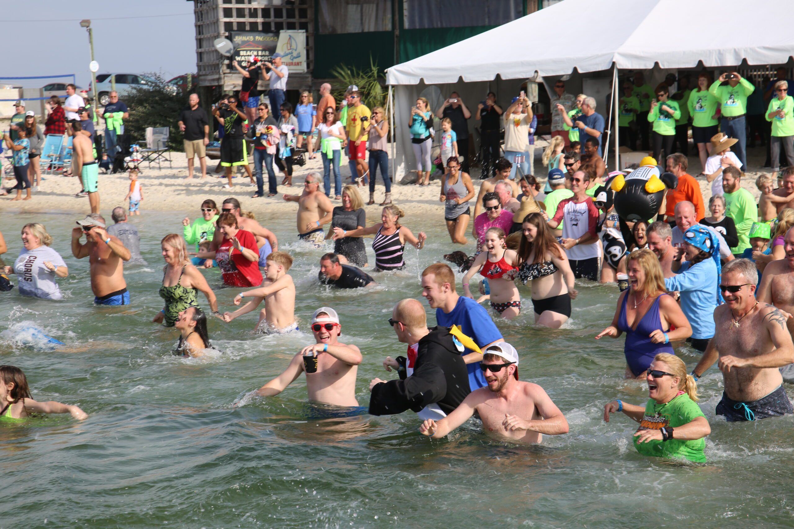 Historically, new year’s day plunges take place in frigid waters and cold temperatures making it a challenge to complete. But when you live in Florida, it isn’t such a challenge, especially this winter. With temperatures in the 70s, weather conditions were favorable as hundreds of locals and visitors plunged into Navarre Beach’s waters new year’s day. It was part of the second annual Pelican Plunge at the fishing pier and the Penguin Plunge at Juana’s Pagodas.