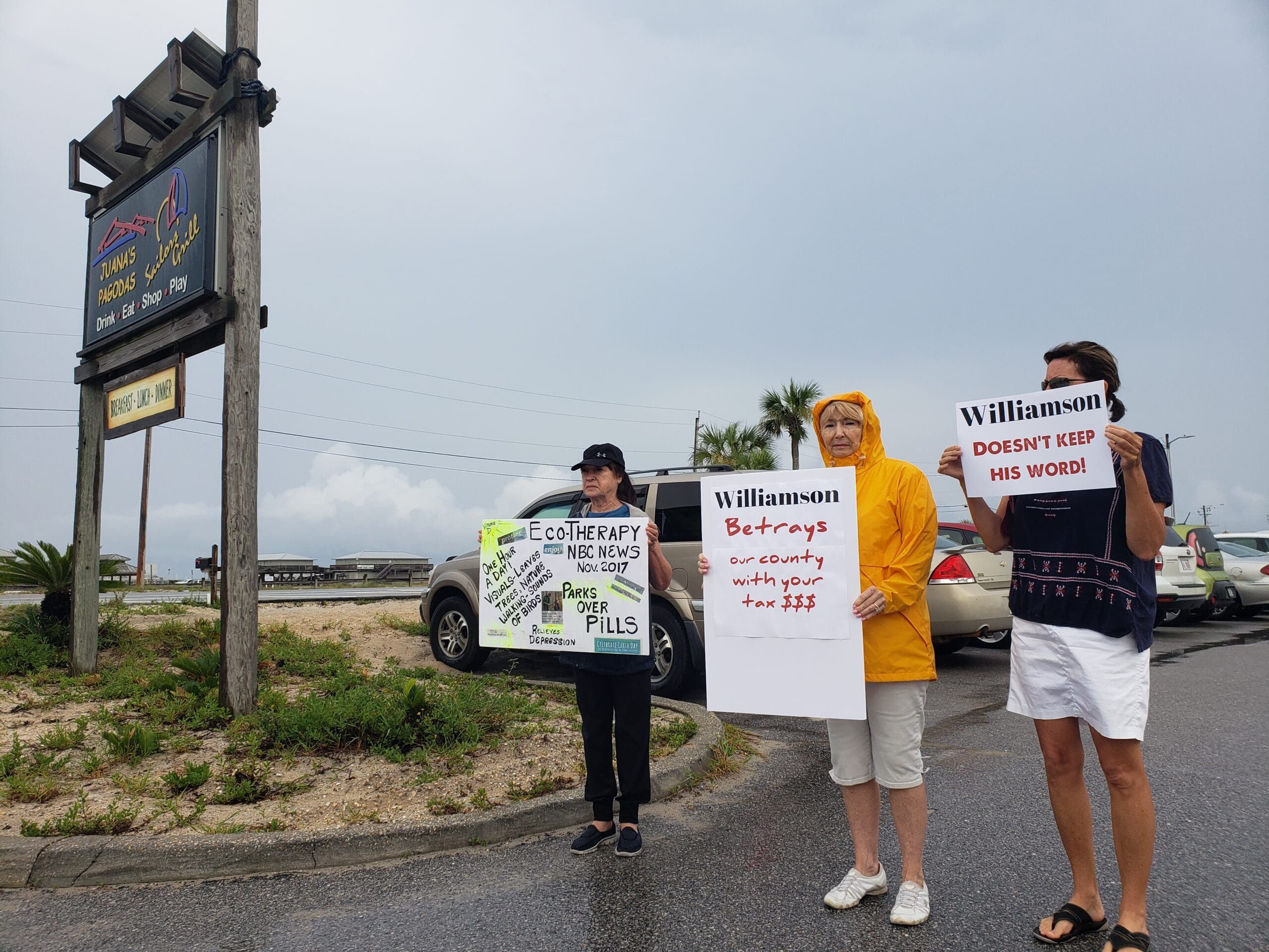 While District 4 County Commissioner Rob Williamson held an invitation-only meet and greet with supporters at Juana’s Pagodas and Sailors’ Grill early Monday morning, residents of Navarre stood outside in the rain waving signs calling for the incumbent to be ousted from office.