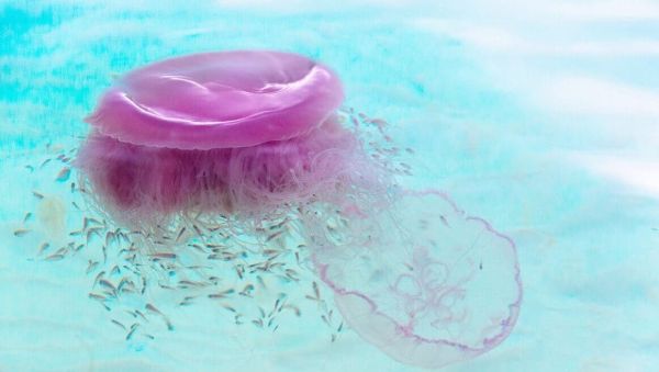 A pink meanie consumes another jellyfish. Small fish are seen swimming around its tentacles.